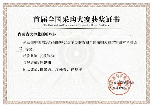 2024年12月1-2日,中國物流與采購聯(lián)合會主辦,深圳交易集團有限公司和中國石油物資有限公司承辦,深圳交易研究院有限公司和北京物資學院共同協(xié)辦的首屆全國采購大賽決賽及頒獎典禮在深圳舉行。由我院運輸工程系任建偉教授指導,相馨語(物流2202班)、江梓萱(物流2202班)、任貝寧(物流2202班)組成的“北疆明珠隊”榮獲全國二等獎。